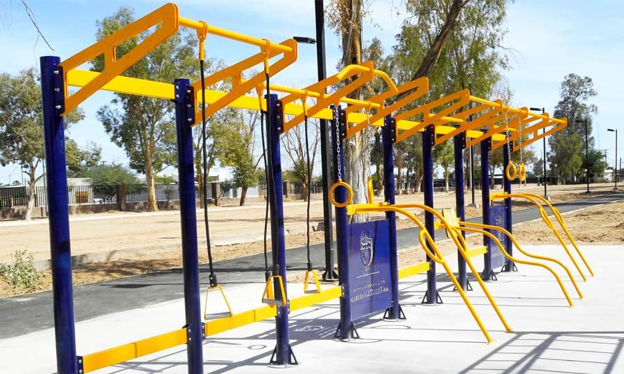 Aparatos crossfit de la línea EXERSIS instalados en un parque público.