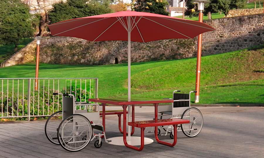 Mesa de picnic con sombrilla para cuatro sillas de ruedas.