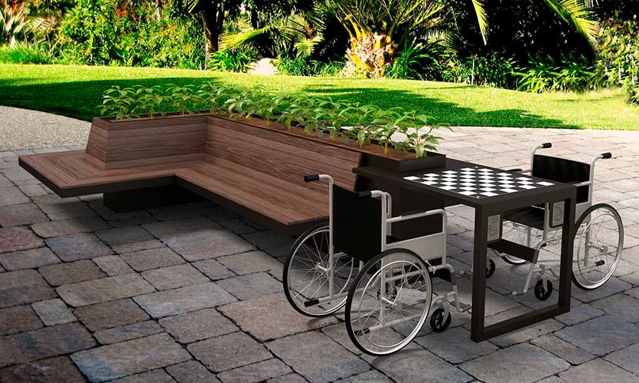 En INOPLAY estamos convencidos que el mundo debe de ser un lugar inclusivo es por ello que hemos creado una línea de mobiliario especialmente diseñado para que personas con discapacidad tengan acceso a la integración social en espacios urbanos, ya sea en parques públicos, andadores o centros comerciales, ofrecemos elementos de mobiliario urbano inclusivo que se pueden adaptar según las necesidades de su proyecto, proponiendo espacios para todos, que garanticen un mejor ambiente social.