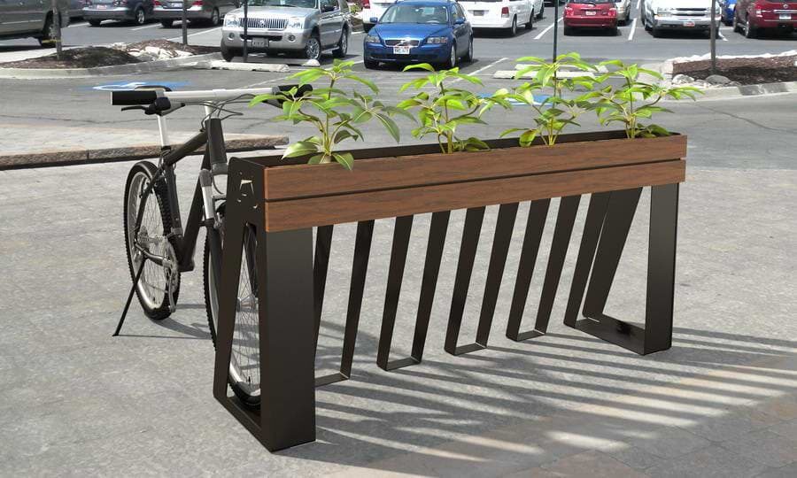 Bicipuerto con jardinera en la parte superior y detalles en plastimadera.