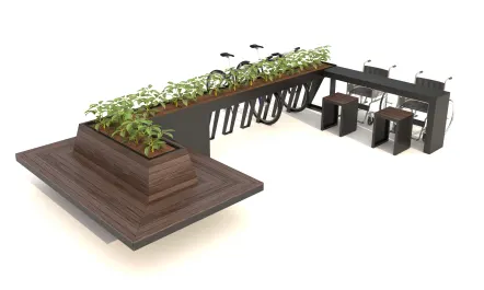 Mobiliario urbano incluyente, banca con espacio intermedio para personas en silla de ruedas.
